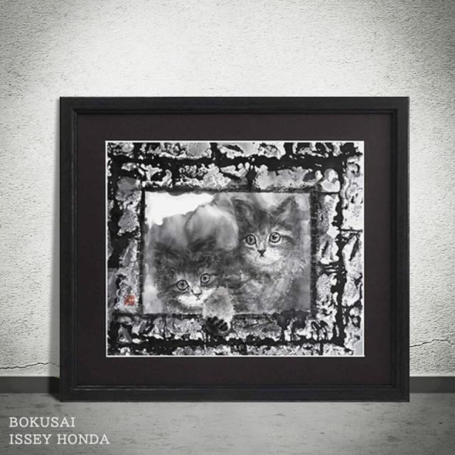 本田一誠 アートパネル 猫 インテリア モノクロ 壁掛け おしゃれ 絵【枠シリーズ ネコ】玄関 風水 和風 水墨画