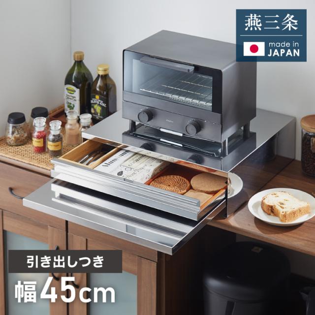 日本製 燕三条 キッチン家電下スライドテーブル 引出し付き 幅45 頑丈 ステンレス製 スライドトレー 引き出し 収納 レンジ下 トレー 完成品(代引不可)【送料無料】