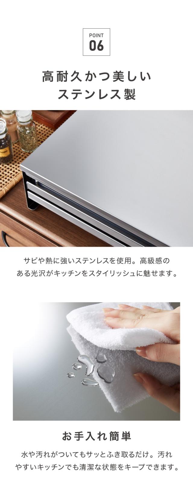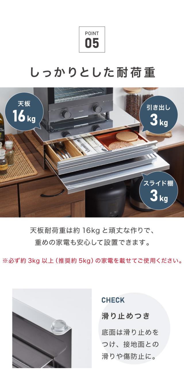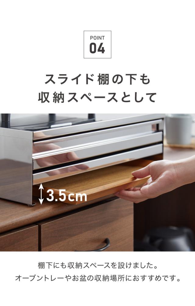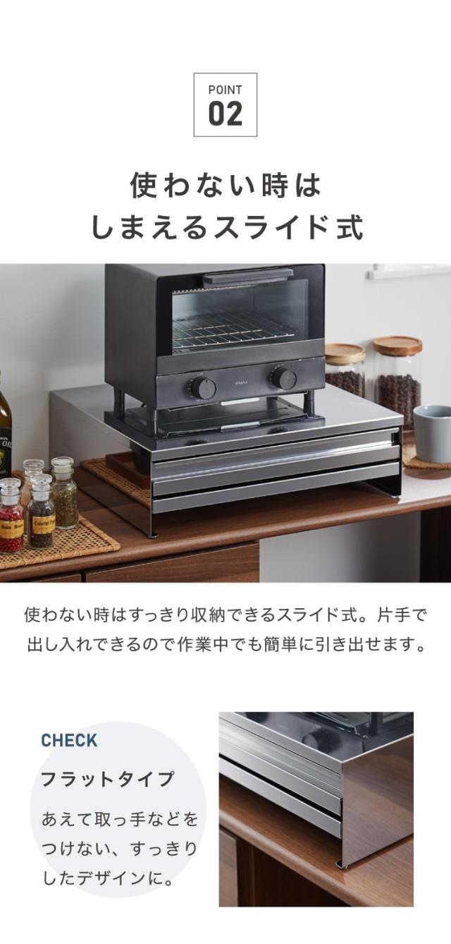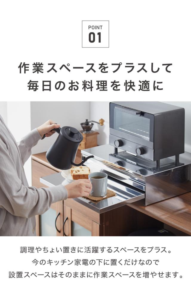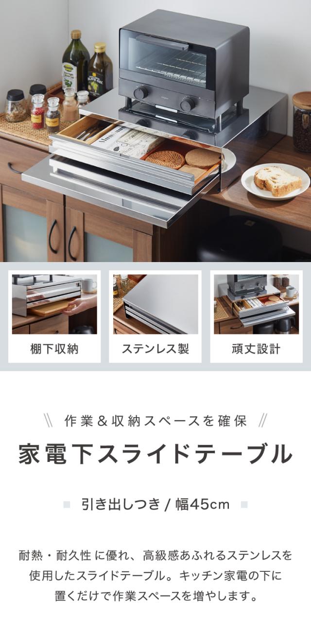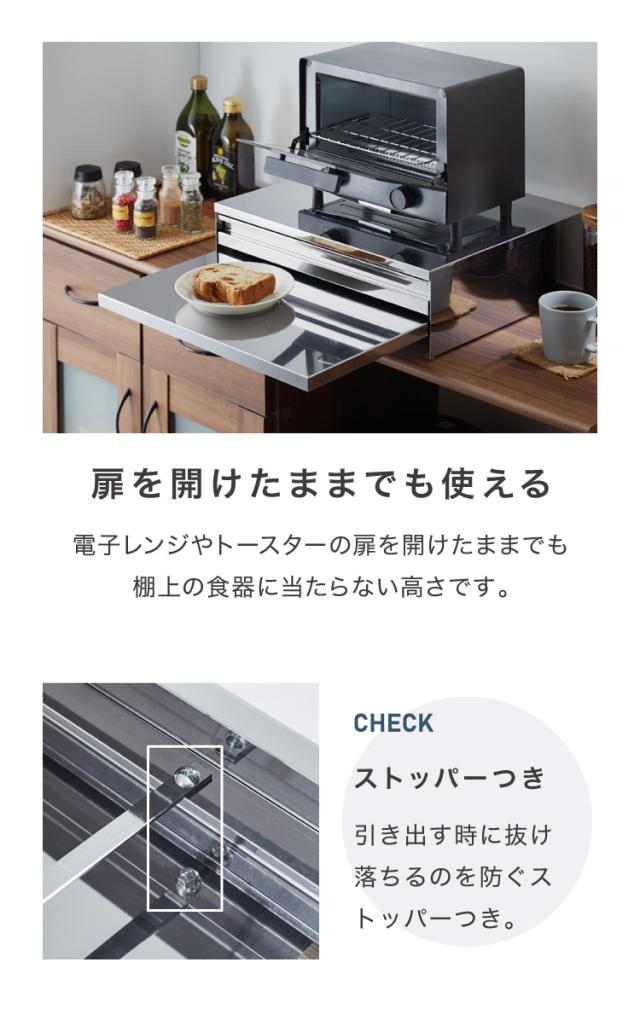 家電下、スライドテーブル、スライドトレー、ステンレス、日本製、燕三条、国産、キッチン収納、レンジラック、レンジ台、作業台、作業トレー、電子レンジ、炊飯器、トースター、カウンター上