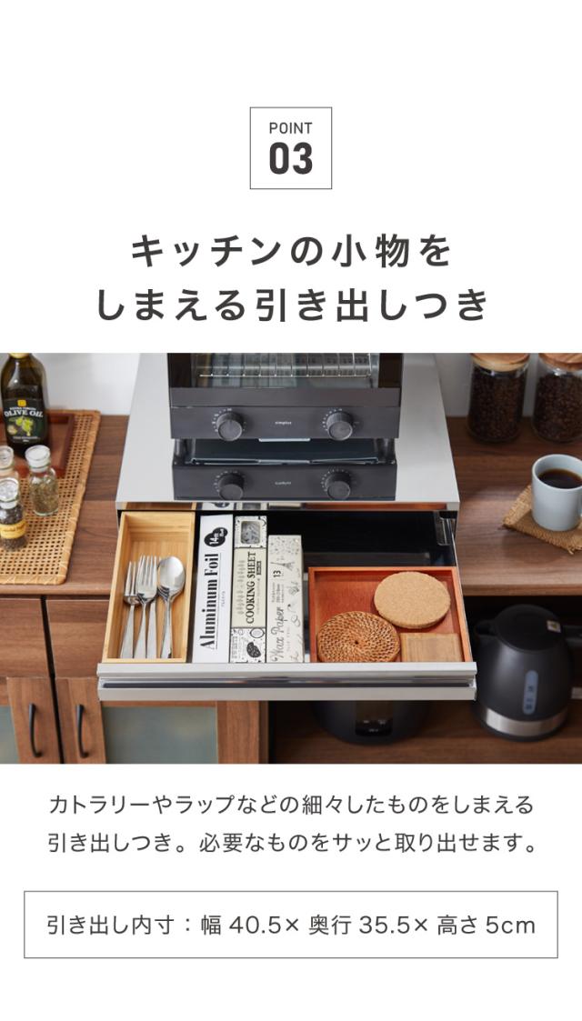 また、引き出し収納付きでラップやカトラリーなどちょっとしたキッチン用品を収納することができます。
