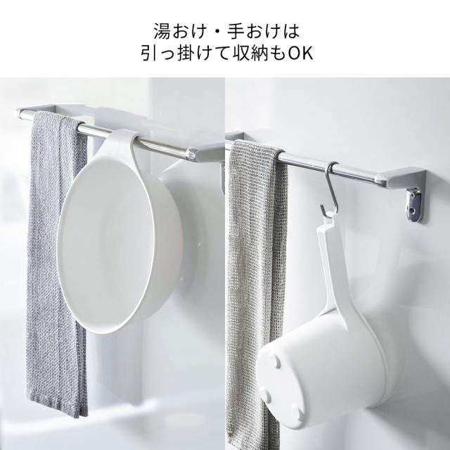 引っ掛け収納もOKな湯おけ湯おけにはくるんとした形状がおしゃれなフック付き。タオルバーや物干し竿、シャワーフックに引っ掛けることがもできます。