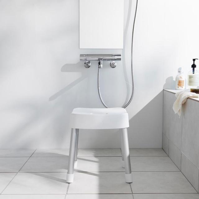 風呂イスは座面中央に腰掛けてご使用ください。荷重を片側にかけるような座り方をすると、転倒する可能性があります。