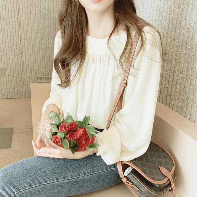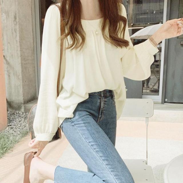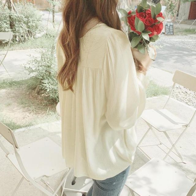 ふんわりとしたシルエットに透け感のあるシフォン素材で仕上げ長袖シャツブラウス