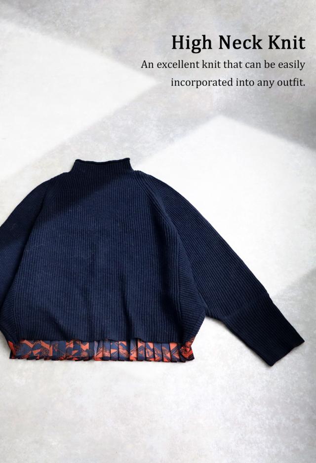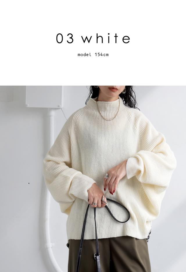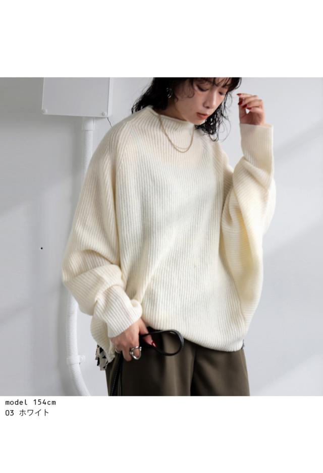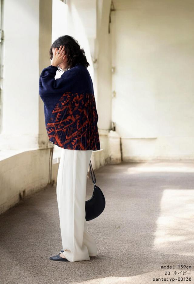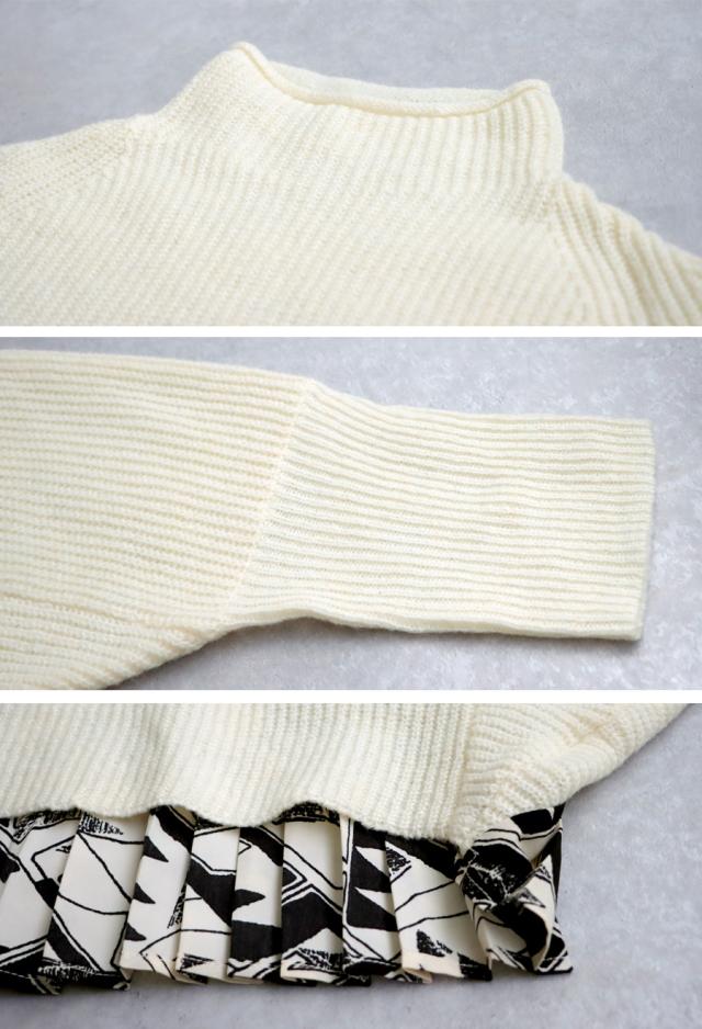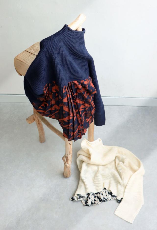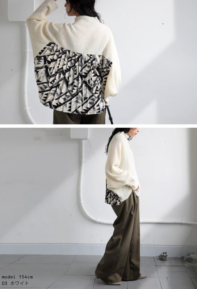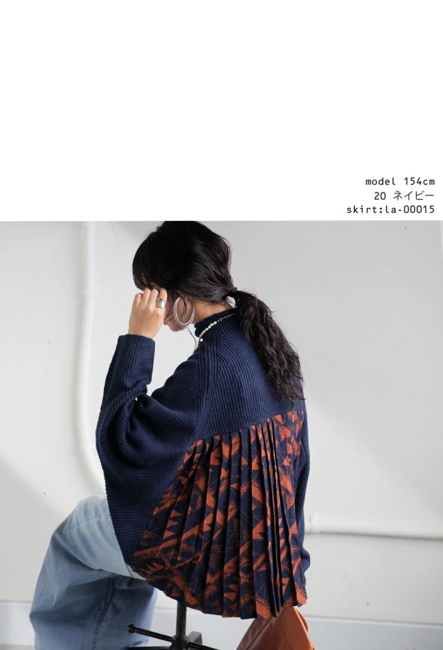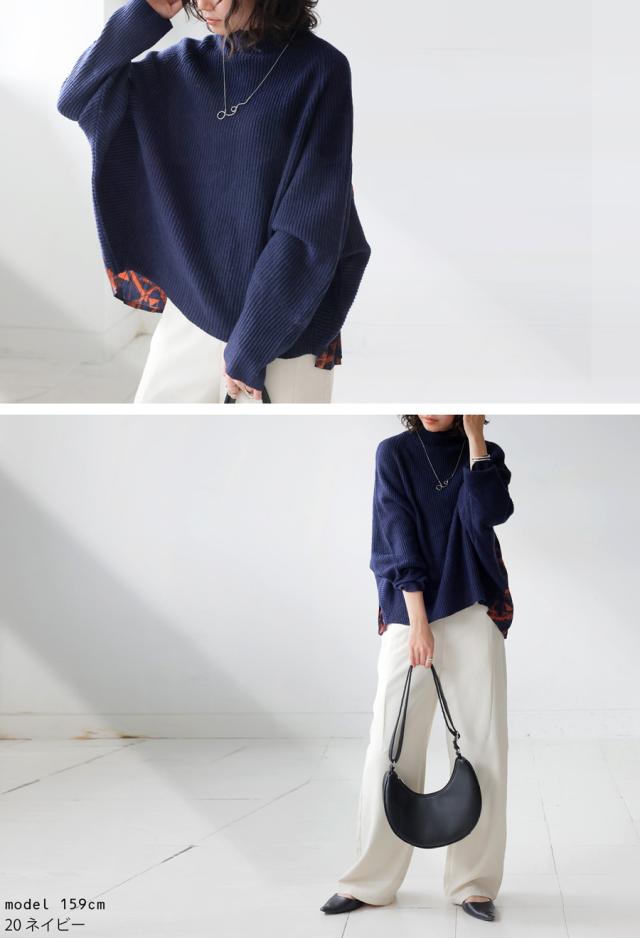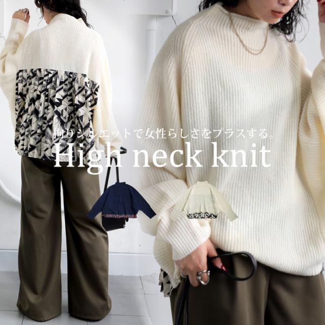 pk-01199 長袖 ハイネック 畦編み ドルマン プリーツ 布帛 ニット素材 柄 無地 異素材 切り替え 前後差 ゆったり シンプル きれいめ 上品 体型カバー 着痩せ 大きめ セーター