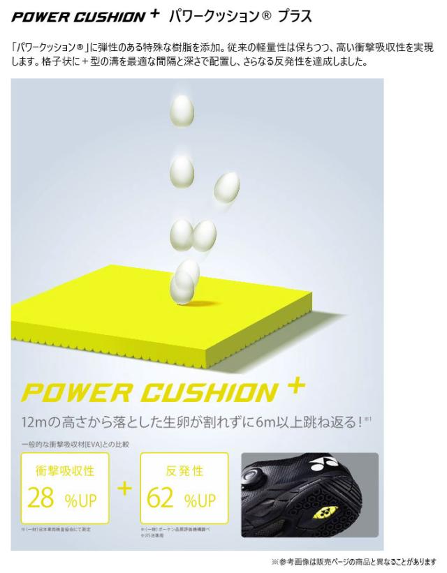 衝撃吸収性と反発性を併せ持つ衝撃吸収反発素材「パワークッション」がさらに進化。素材や形状の研究を重ね、従来の軽量性を維持しながら、衝撃吸収性28%アップ・反発性62%アップ(一般的な衝撃吸収材[EVA]との比較)を実現し、12mの高さから落とした生卵が、割れずに6m以上跳ね返る(※ヨネックス(株)調べ)新衝撃吸収反発素材。