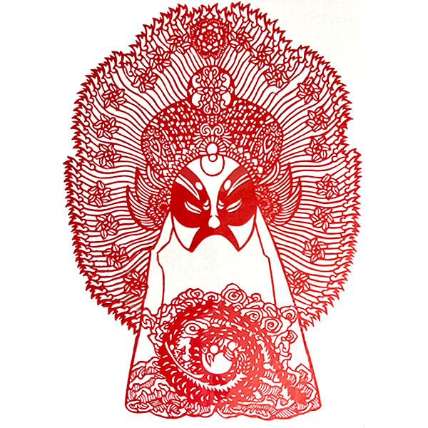 この美しい中国伝統工芸「切り絵」は、三国志の英雄、関羽をモチーフにしています。