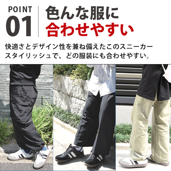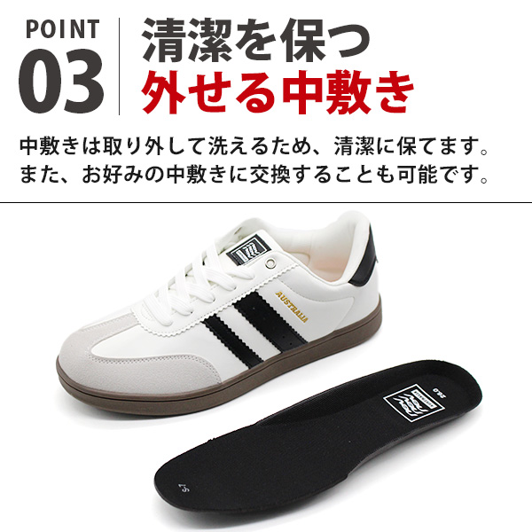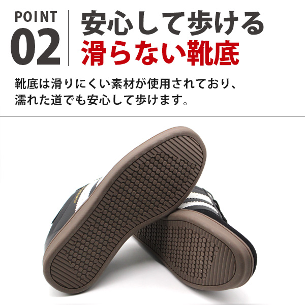 快適さとデザイン性を兼ね備えたこのスニーカー。スタイリッシュでどの服装にも合わせやすい。靴底は滑りにくい素材が使用されており、濡れた道でも安心して歩けます。中敷きは取り外して洗えるため、清潔に保てます。また、お好みの中敷きに交換することも可能です。