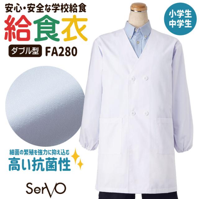 サーヴォ 給食白衣 前ボタン ダブル 長袖 給食衣 給食着 白衣 給食 抗菌 ホワイト 入学準備 新学期 配膳 調理実習 家庭科 学校給食 小学生 中学生 児童 男の子 女の子 子ども 子供 男女兼用 大きいサイズ ネコポス sv-fa280-b
