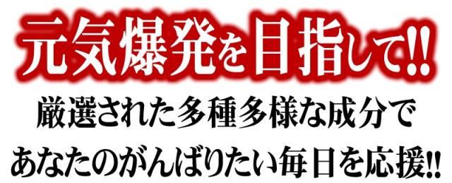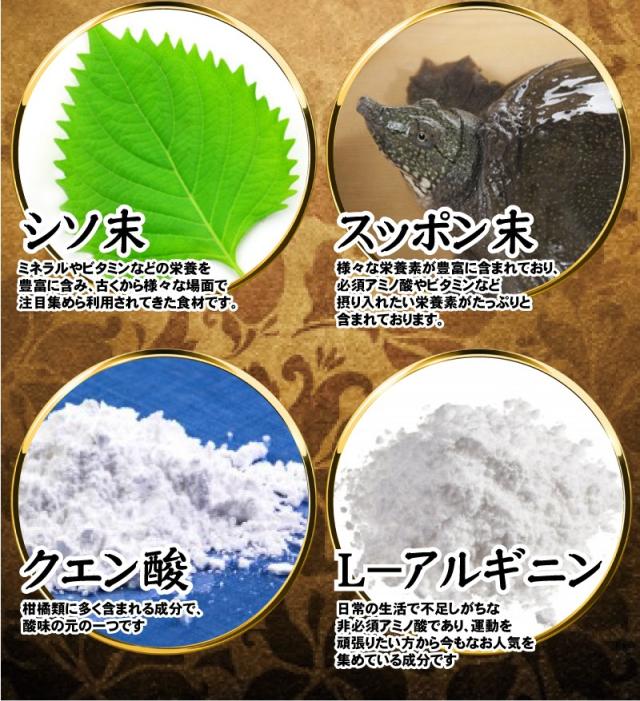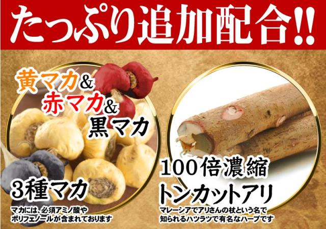 | 原材料名 | 醗酵黒にんにく、シソ末、デキストリン、トンカットアリエキス、スッポン末、烏骨鶏卵黄油末、植物発酵末、マカ末、黒マカ、赤マカ、/セルロース、クエン酸、ステアリン酸カルシウム、ビタミンB6、L-アルギニン、ビタミンC、ナイアシン、ビタミンE、パントテン酸Ca、ビタミンB2、ビタミンB1、ビタミンA、葉酸、ビタミンD、ビタミンB12(原料の一部に卵、りんご、やまいもを含む) |