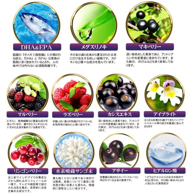 | 原材料名 | ビルベリーエキス末(国内製造)、マキベリー果実粉末、ルテイン含有マリーゴールド抽出物、メグスリノキ末、アイブライトエキス末、ブラックカラント抽出エキス末、ラズベリー果汁粉末、アサイーエキス末、インディアンマルベリーパウダー、DHA ・EPA 含有精製魚油、リンゴンベリー抽出物( レスベラトロール含有)、焼成サンゴカルシウム水素パウダー、植物発酵生成物、野草発酵植物エキス粉末、植物発酵エキス末( デキストリン、糖類、野草、果物、野菜、海藻エキス) / 結晶セルロース、ショ糖脂肪酸エステル、微粒二酸化ケイ素、炭末色素、ヒアルロン酸、ヘマトコッカス藻色素、ビタミンC、ナイアシン、ビタミンE、パントテン酸カルシウム、ビタミンB1、ビタミンB6、ビタミンA、ビタミンB2、葉酸、ビタミンD、ビタミンB12、(一部に乳成分・小麦・落花生・キウイフルーツ・オレンジ・リンゴ・バナナ・大豆・ゴマ・カシューナッツ・やまいも・ももを含む) |