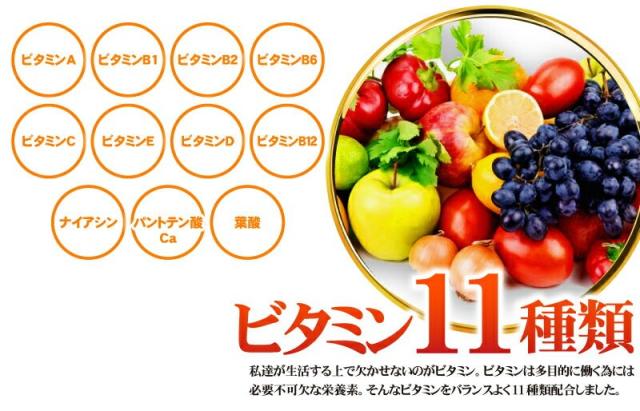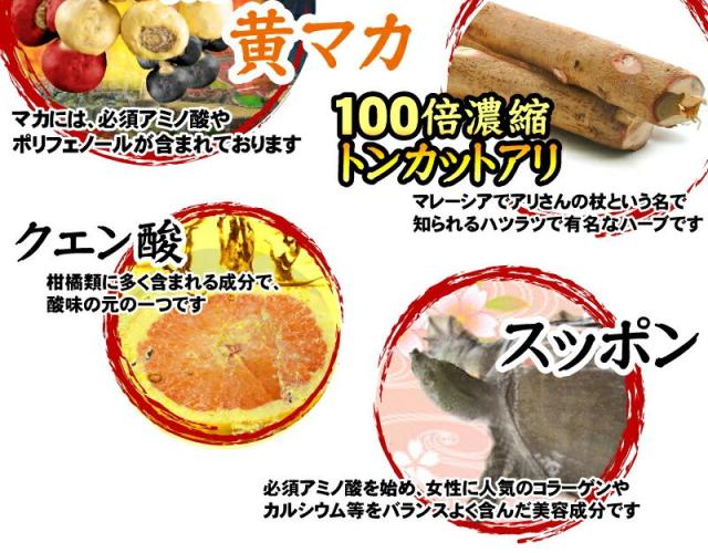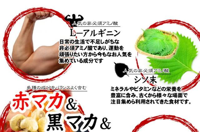 | 原材料名 | 醗酵黒にんにく末、シソ葉末、マカエキス末、すっぽん末、トンカットアリエキス末、烏骨鶏卵黄油、野草発酵エキス、春ウコン末、秋ウコン末、黒ウコン末/結晶セルロース、クエン酸、ステアリン酸カルシウム、ビタミンB6、L−アルギニン、ビタミンC、抽出ビタミンE、ナイアシン、パントテン酸カルシウム、ビタミンB1、ビタミンB2、ビタミンA、葉酸、ビタミンD、ビタミンB12(原材料の一部にりんご、やまいも含む) |