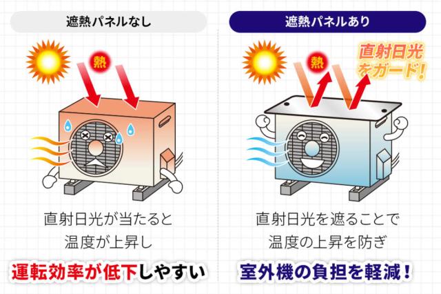 遮熱パネルで直射日光を遮り、太陽熱による温度の上昇を抑えてエアコン室外機の負担を軽減します。余分な電力消費が少なくなるので運転効率がアップし、省エネにつながります。