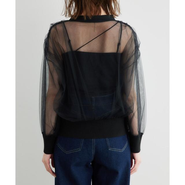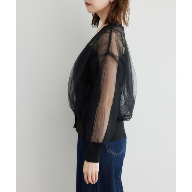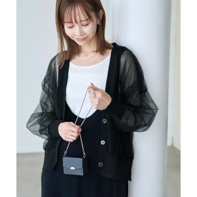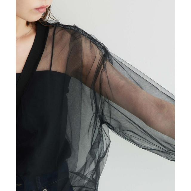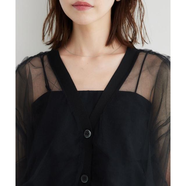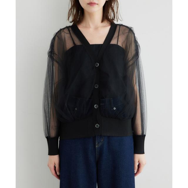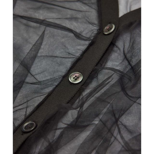 ・シアーなチュール素材の長袖Vネックカーディガン。