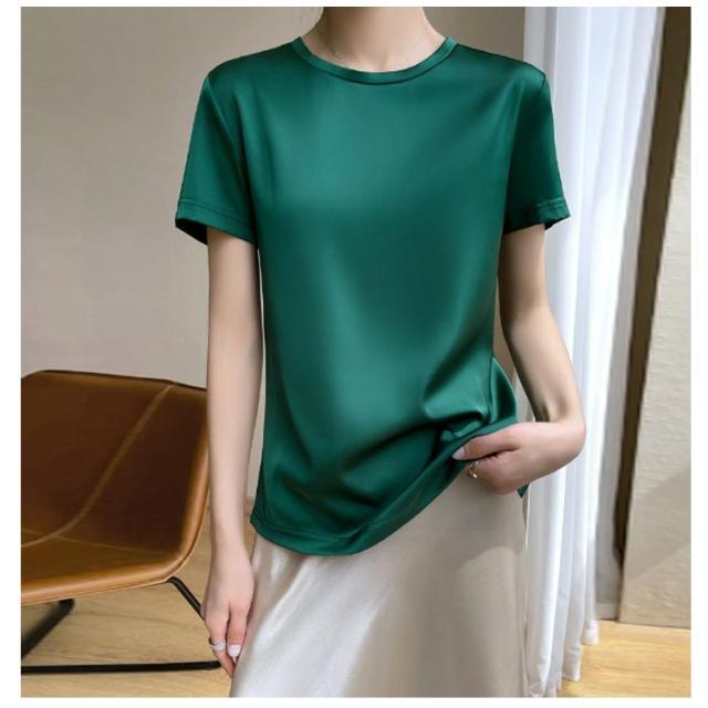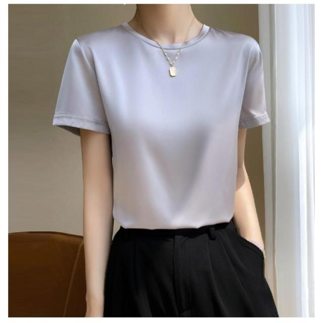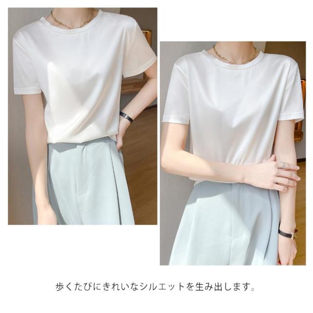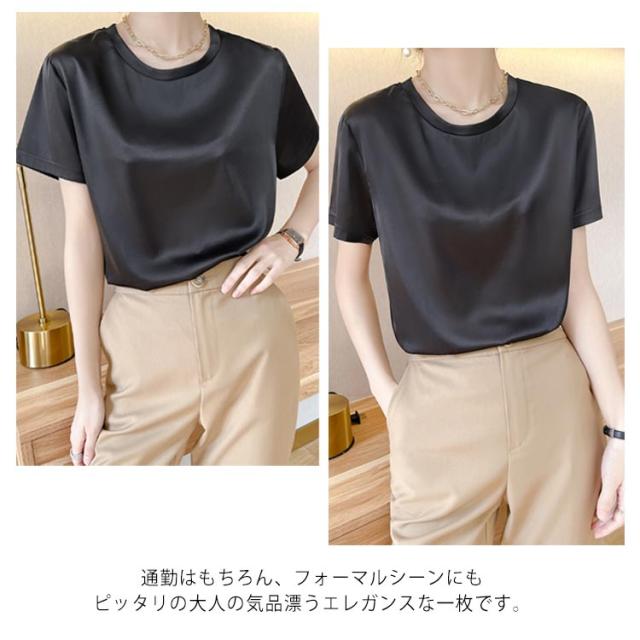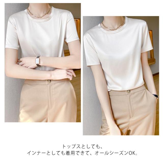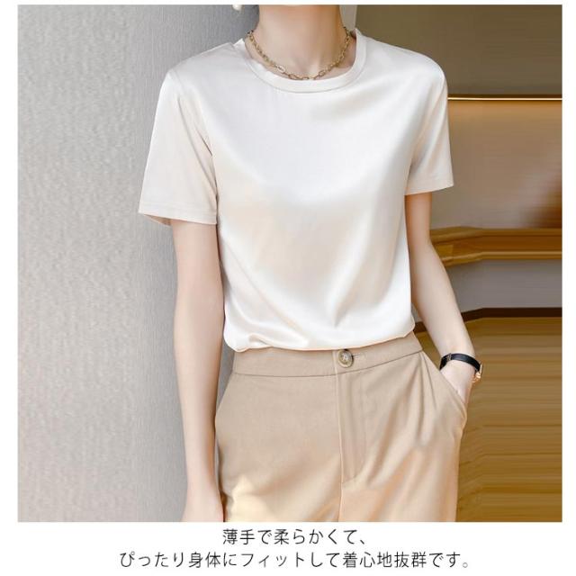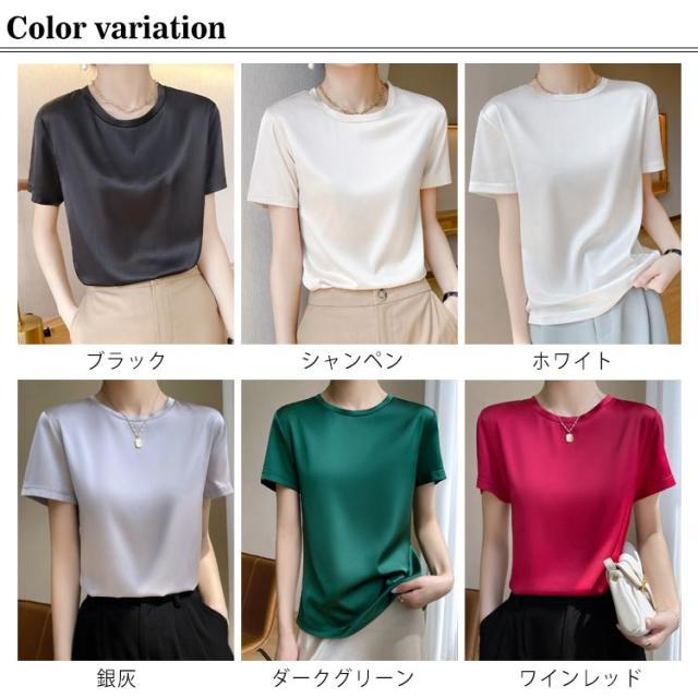 | サラッと快適なサテン生地の半袖トップス シンプルなシルエットにサテンの光沢感が目を魅かれるレディースシャツです。 歩くたびにきれいなシルエットを生み出します。 薄手で柔らかくて、ぴったり身体にフィットして着心地抜群です。 トップスとしても、インナーとしても着用できて、オールシーズンOK。 女性らしいエレガントな雰囲気を醸し出し、ジャケットなどを羽織ればきちんとコーディネートの中に華やかさをプラス。 通勤はもちろん、フォーマルシーンにもピッタリの大人の気品漂うエレガンスな一枚です。 | |