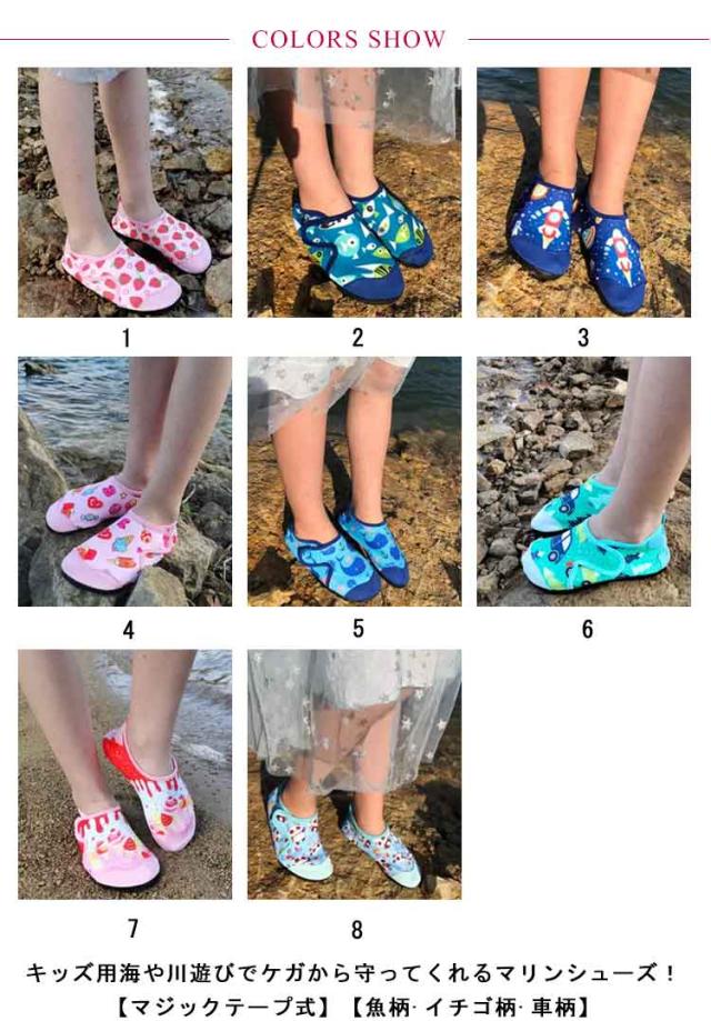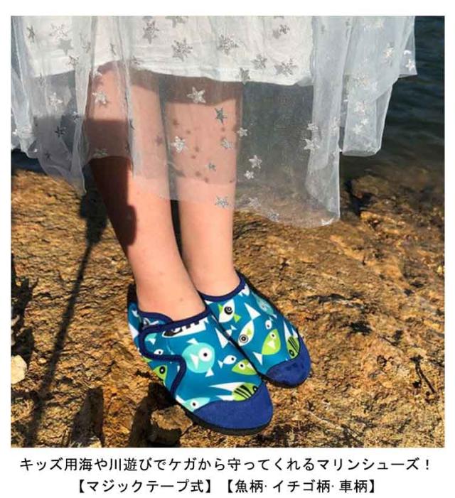 | キッズ用海や川遊びでケガから守ってくれるマリンシューズ!【マジックテープ式】【魚柄?イチゴ柄?車柄】 マジックテープでサイズ感の調節ができます 水場での怪我予防に:サンダルよりも丈夫な素材でしっかりと足にフィット。水場でも脱げることなく足をケガから守ります。\足元が見えない深さや熱い砂浜でも安心♪/ 足場が悪くても滑りにくい:グリップ力が強く、滑りにくいゴムソールを使用。滑りにくく、転倒する心配が軽減されて安心安全◎ 優れた速乾性:乾きやすい素材で、濡れた後にも扱いやすい。そのまま車などの乗り物にも乗れる軽快さ!\川や海で遊んでそのままドライビング!/\履いたままOK!/ 脱ぎ履きらくらく:スニーカー感覚で履けて脱ぎ履きしやすく軽量なのでストレスフリー。快適に過ごせる♪ | |
