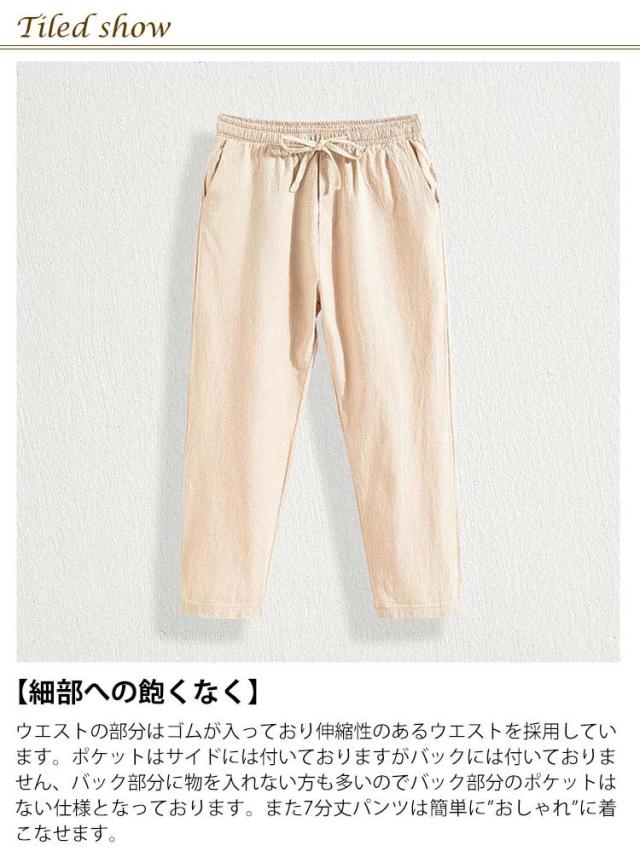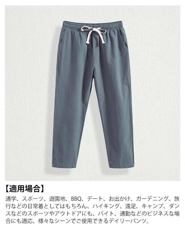 | 【上質生地】 軽くて上質な綿と麻の混紡生地で仕上げて、暑い夏でも快適に着用できるパンツを目指しています。 綿と麻の混紡生地は手触りが柔らかく、軽くて通気性にも優れていて、快適に着用できます。 【細部への飽くなく】 ウエストの部分はゴムが入っており伸縮性のあるウエストを採用しています。 ポケットはサイドには付いておりますがバックには付いておりません、バック部分に物を入れない方も多いのでバック部分のポケットはない仕様となっております。 また7分丈パンツは簡単に”おしゃれ”に着こなせます。 【使いやすさ】 夏秋に活躍必至のサルエルパンツ仕様であることもポイントです。 サイズ展開もM-5XLと豊富なカラーで、年齢問わず、10代 20代 30代 40代 幅広い年代の方に穿いて頂けるようになっています。 【適用場合】 通学、スポーツ、遊園地、BBQ、デート、お出かけ、ガーデニング、旅行などの日常着としてはもちろん、ハイキング、遠足、キャンプ、ダンスなどのスポーツやアウトドアにも、バイト、通勤などのビジネスな場合にも適応、様々なシーンでご使用できるデイリーパンツ。 | |
