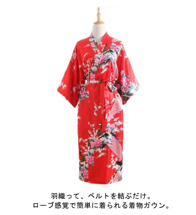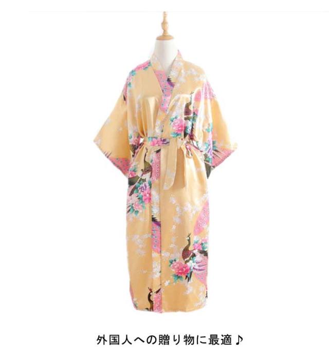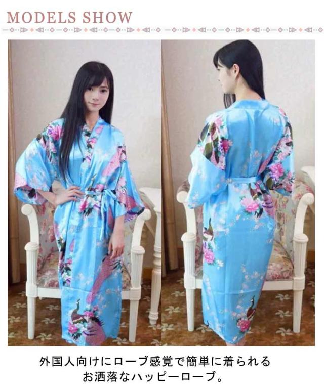 | 外国人への贈り物に最適♪ 外国人向けにローブ感覚で簡単に着られるお洒落なハッピーローブ。 羽織って、ベルトを結ぶだけ。ローブ感覚で簡単に着られる着物ガウン。 シルクのような肌触りと光沢、柔らかくて軽くてツルツルの生地、お風呂上がりやパジャマとしてもお勧め。 孔雀と花のゴージャスな柄、舞台やステージの衣装にも◎ おうち時間のリラックスタイムや和風のコスプレ、外国のお友達へのプレゼントなどにも。 | |
