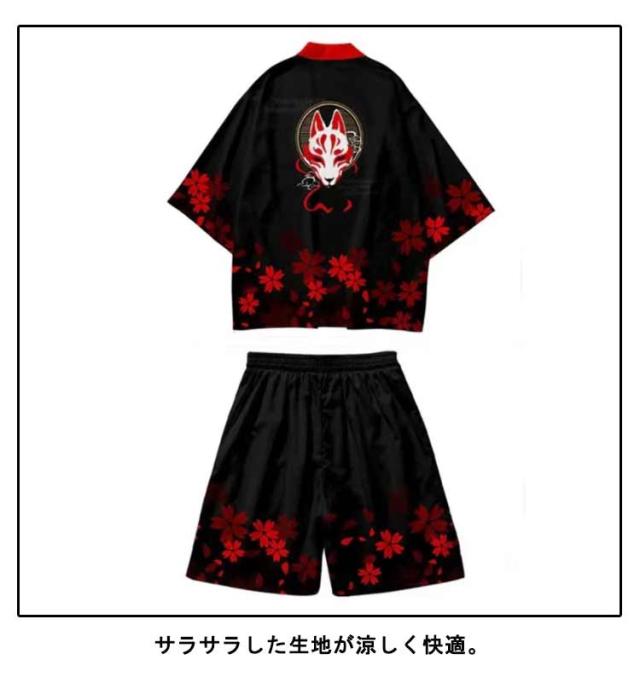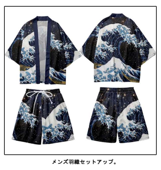 和風 セットアップ 羽織 法被 着物風 はっぴ 浴衣 荒波 カーディガン ショートパンツ ゆかた 和柄 甚平 海 半被 半纏 じんべい ハーフパンツ セパレート メンズ夏上下セット 和装 着物 花火大会 夏物 夏祭り 涼しい おしゃれ