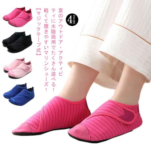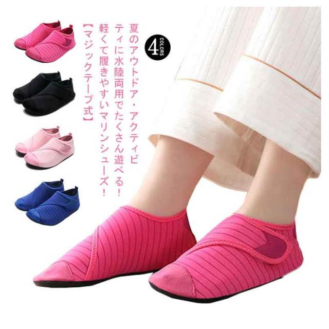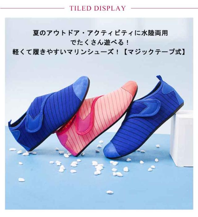 | 夏のアウトドア・アクティビティに水陸両用でたくさん遊べる!軽くて履きやすいマリンシューズ!【マジックテープ式】 マジックテープでサイズ感の調節ができます 水場での怪我予防に:サンダルよりも丈夫な素材でしっかりと足にフィット。水場でも脱げることなく足をケガから守ります。\足元が見えない深さや熱い砂浜でも安心♪/ 足場が悪くても滑りにくい:グリップ力が強く、滑りにくいゴムソールを使用。滑りにくく、転倒する心配が軽減されて安心安全◎ 優れた速乾性:乾きやすい素材で、濡れた後にも扱いやすい。そのまま車などの乗り物にも乗れる軽快さ!\川や海で遊んでそのままドライビング!/\履いたままOK!/ 脱ぎ履きらくらく:スニーカー感覚で履けて脱ぎ履きしやすく軽量なのでストレスフリー。快適に過ごせる♪ | |