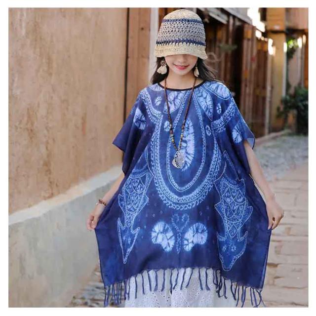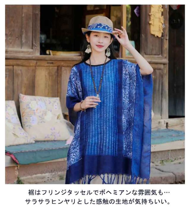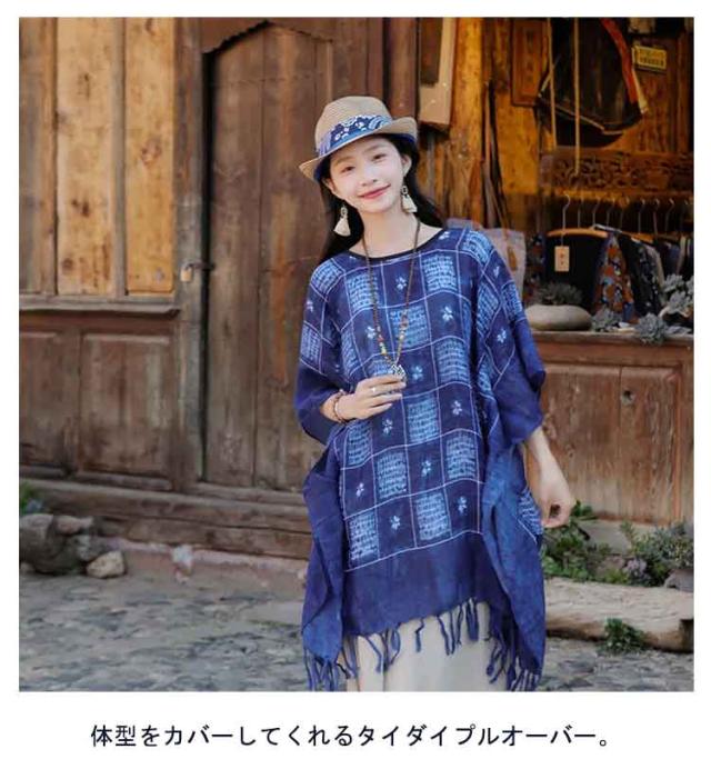 ユニセックス ポンチョ 涼しい 染め ストライプ チュニック フリンジ 柄 サラサラ 軽い タイダイ 羽織 ゆるふわ 変形トップス プルオーバー シンプル 和風 エスニック アジアン レディース メンズ 二の腕カバー