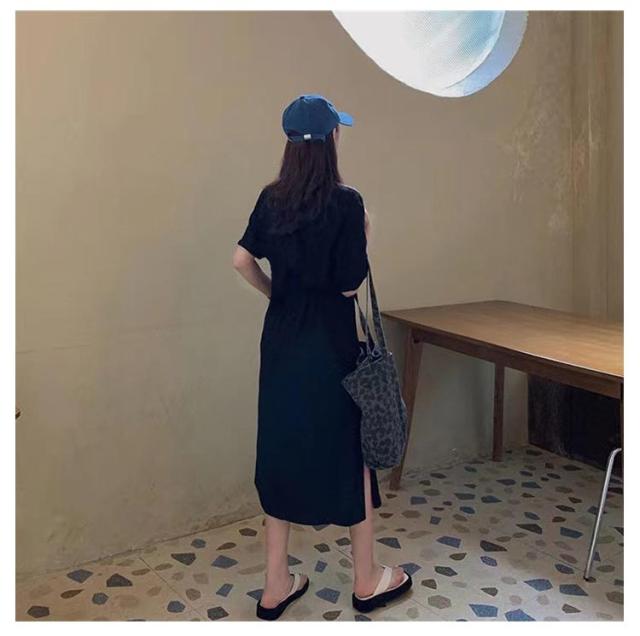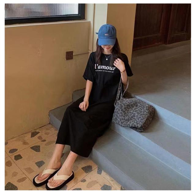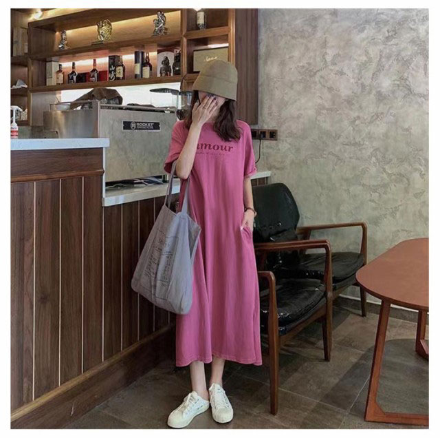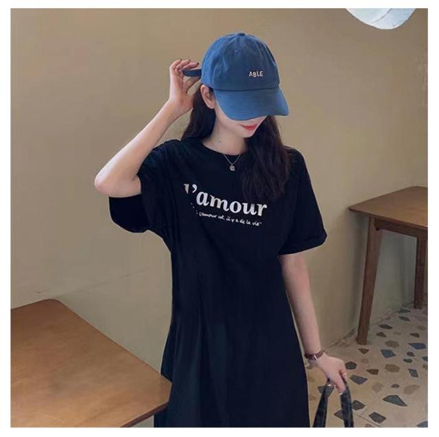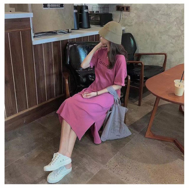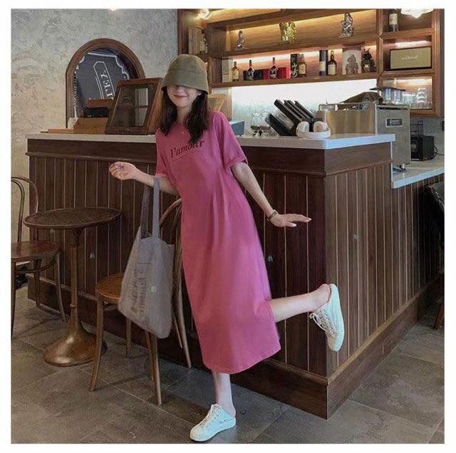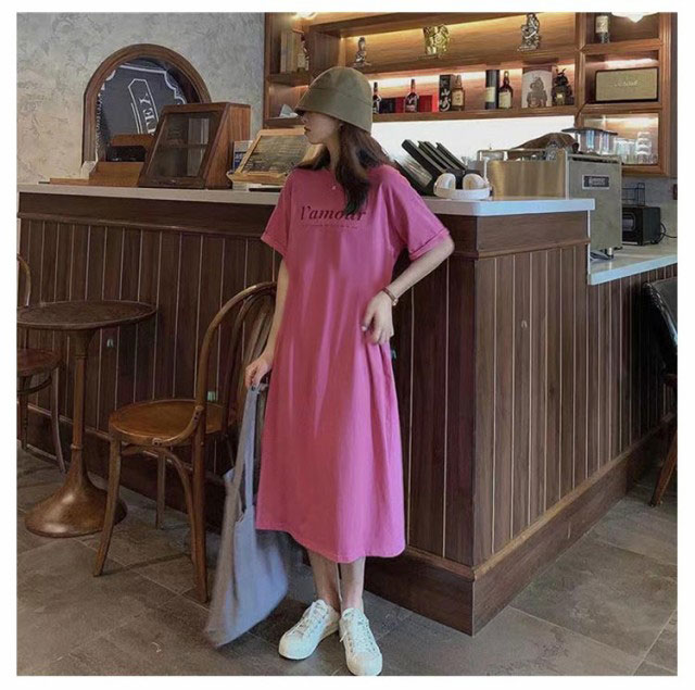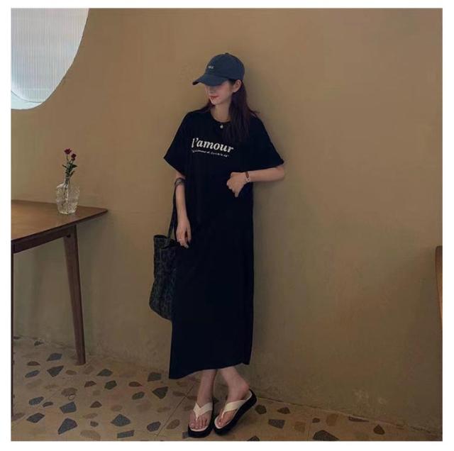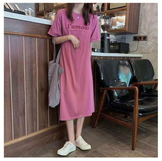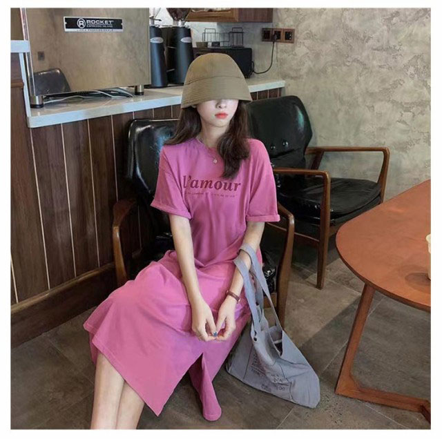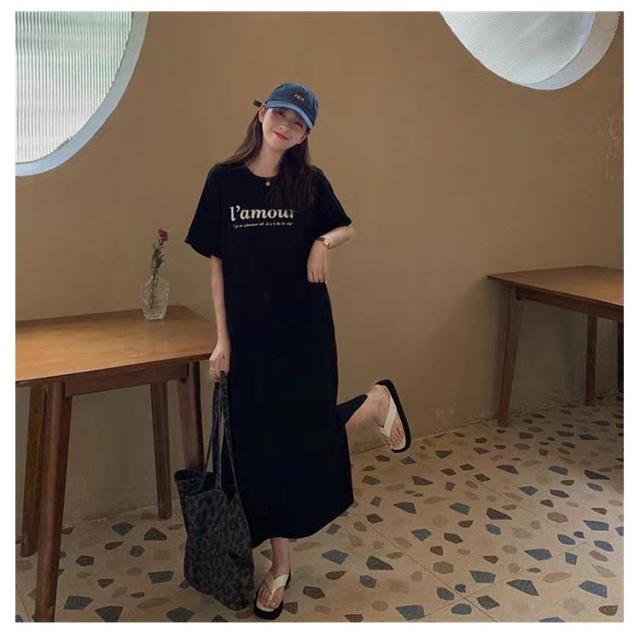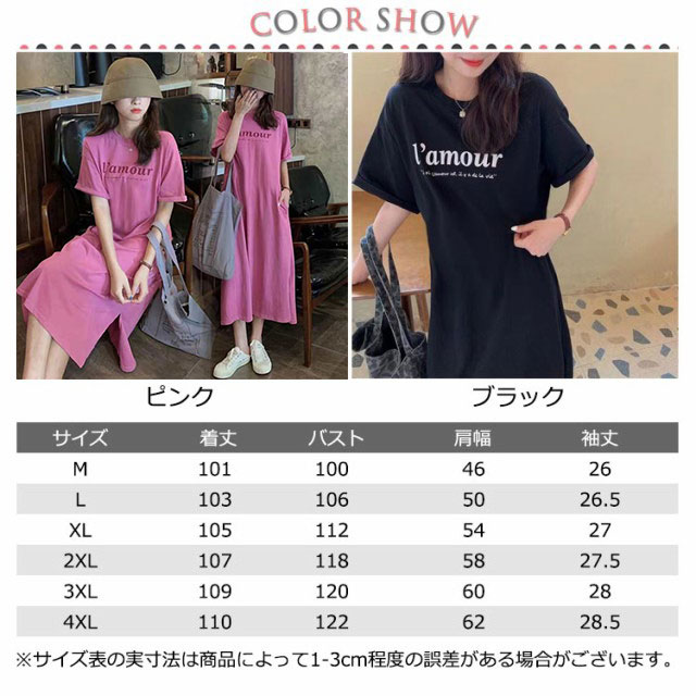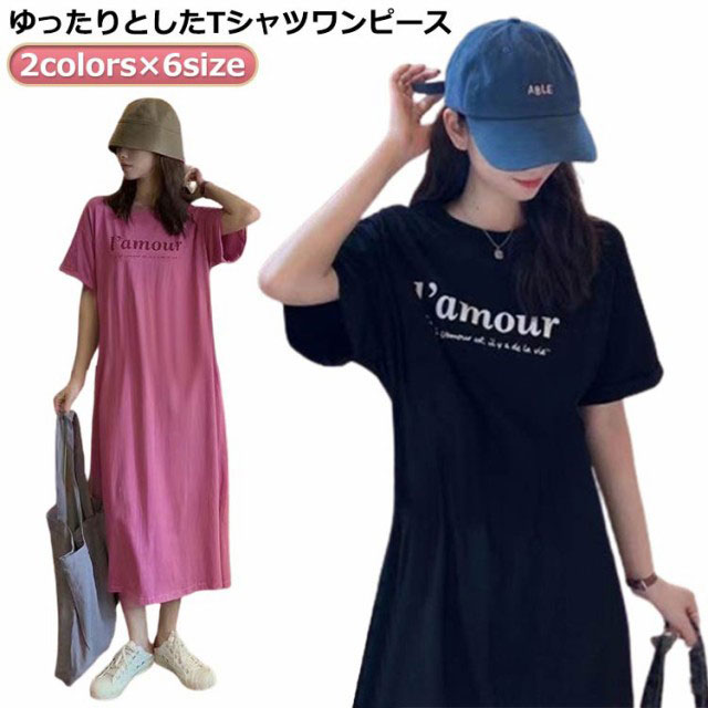 Tシャツ ワンピース 半袖 ロング ロゴ Tシャツ ワンピース レディース 春夏 大人 ロゴ入り クルーネック スリット 春 半袖 ゆったり ルームウェア 大人 カジュアル かわいい 楽ちん 部屋着 マタニティ 韓国ファッション ピンク ブラック 黒