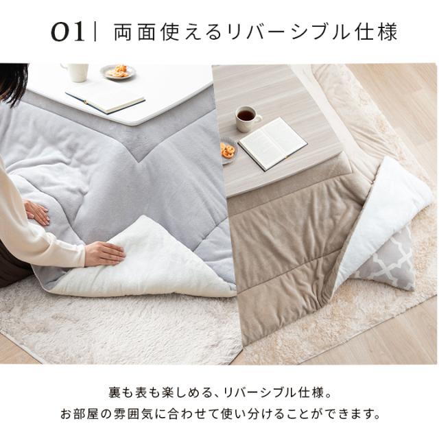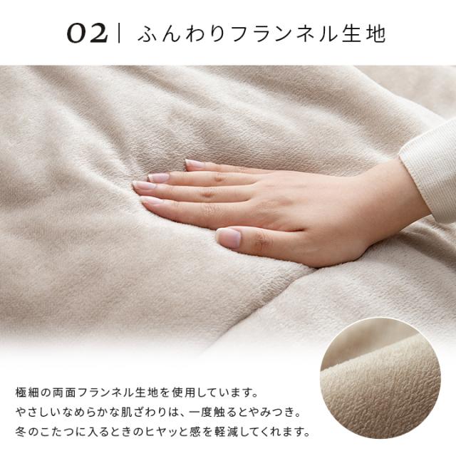 | ■リバーシブル仕様のこたつ布団で、両面にふんわりやわらかなフランネル素材を使用しています。 ■洗濯機で洗えるので清潔にご使用できます。(洗濯ネットをご使用ください ※205×245cmは手洗い) ■コンパクトに収納できるので、収納スペースが少ない方にもおすすめです。 |