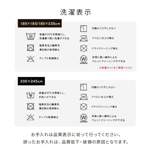 | 185×185cm・185×235cm:液温は30℃を限度とし、洗濯機で弱い洗濯ができる 205×245cm:液温は40℃を限度とし、手洗いができる |