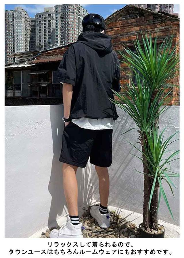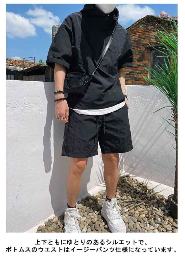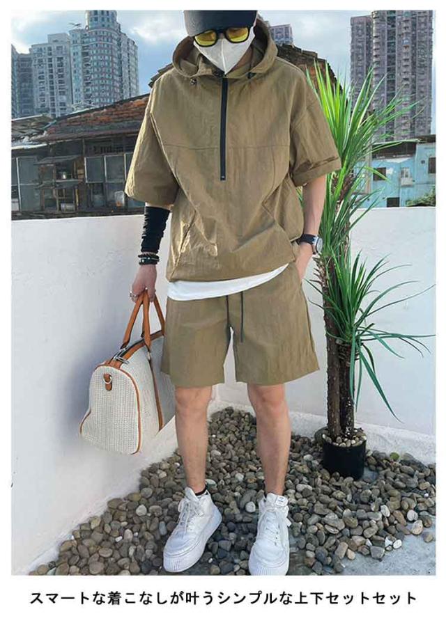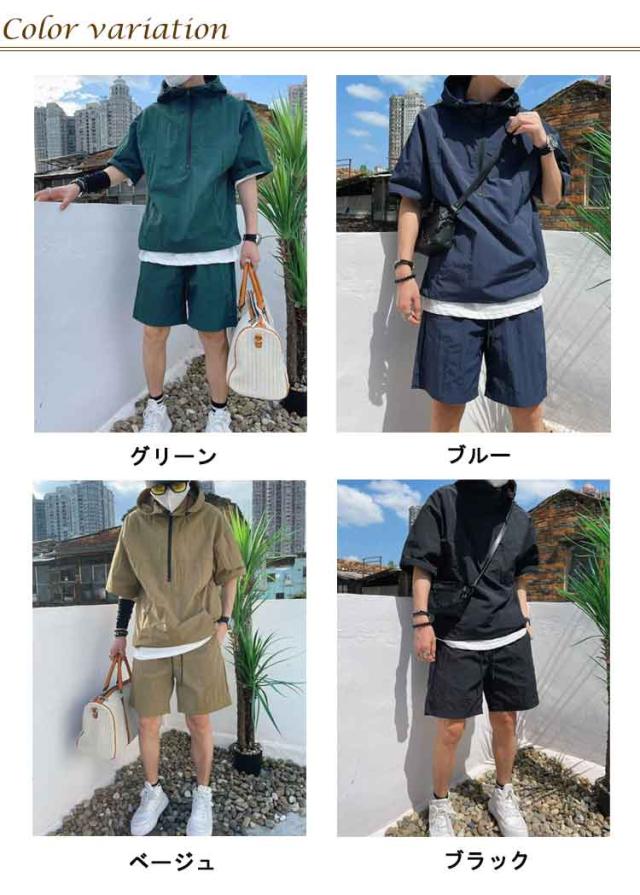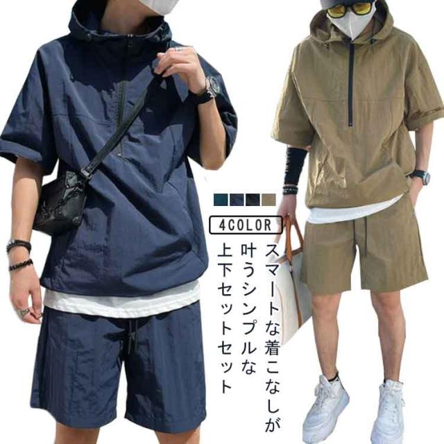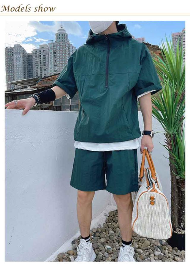 メンズ 涼しい カーゴショーツ 薄手 半袖 快適 夏 カジュアルセットアップ 短パン ハーフジップ ショートパンツ 上下セット ゆったり カーゴショーツ パーカー フード付き アウトドア 大きいサイズ 無地 シンプル 体型カバー お出かけ 普段着 ギフト