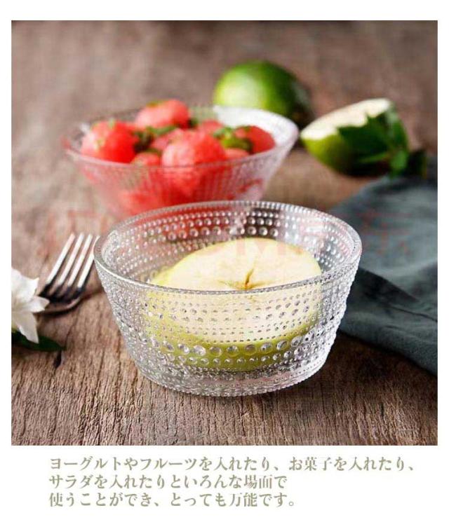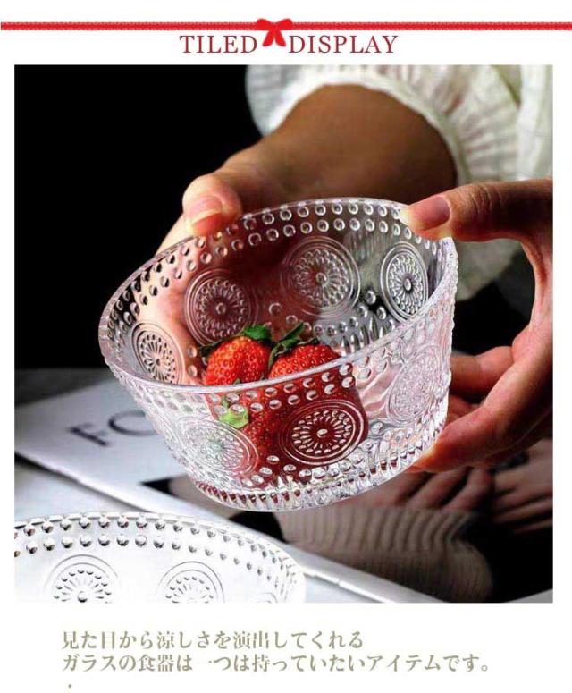 | ・見た目から涼しさを演出してくれるガラスの食器は一つは持っていたいアイテムです。 ・クリアで丈夫、優雅な美しい風合いでおしゃれに使える器。 ・ヨーグルトやフルーツを入れたり、お菓子を入れたり、サラダを入れたりといろんな場面で使うことができ、とっても万能です。 | |