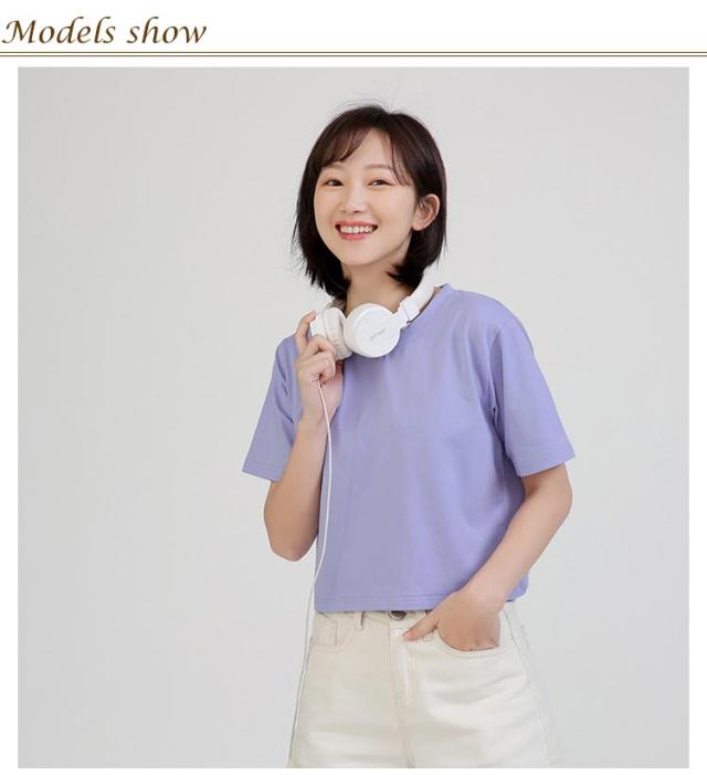 | 大人可愛いショート丈半袖Tシャツ 飽きのこないシンプルなデザインで1枚は持っておきたい万能アイテム! 優しい肌触りで伸縮性もありますので普段使いはもちろん、ヨガやスポーツにもお使い頂けます。 ハイウエストのボトムとコーデを組んでもバッチリ決まります。 豊富なカラー展開も嬉しいポイントです。 | |