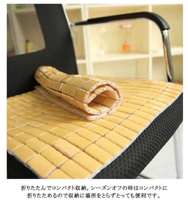 | 夏にオススメ!竹を使用した座布団(マット)です。 接触冷感があり、通気性も抜群♪ 折りたたんでコンパクト収納。シーズンオフの時はコンパクトに折りたためるので収納に場所をとらずとっても便利です。 | |