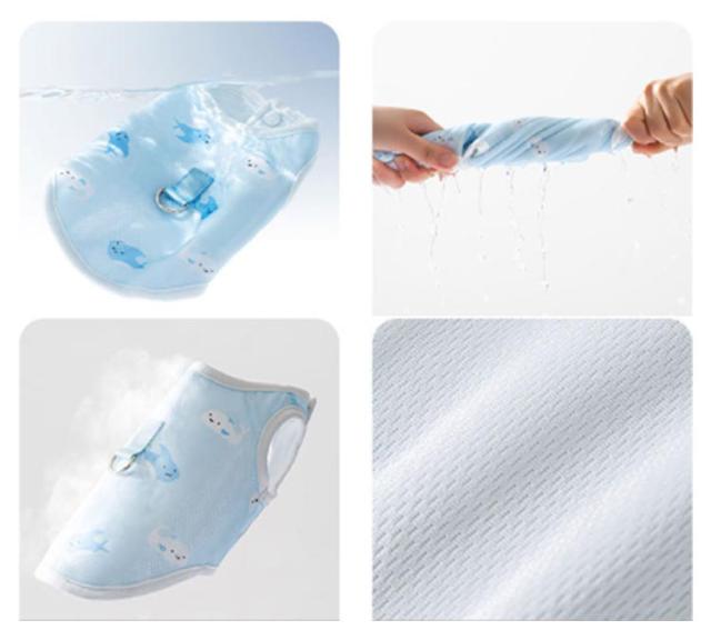| 水で濡らせば冷んやりクールウェア。 肩掛け不要!ベルトを直接装着可能! 着せるめるだけのシンプルな構造なスナップホタンで留めるだけのシンプルな構造なので、着せるのも脱がせるのも簡単です。 暑い夏もとことんクールに!水に濡らして絞って着るだけ。 | |