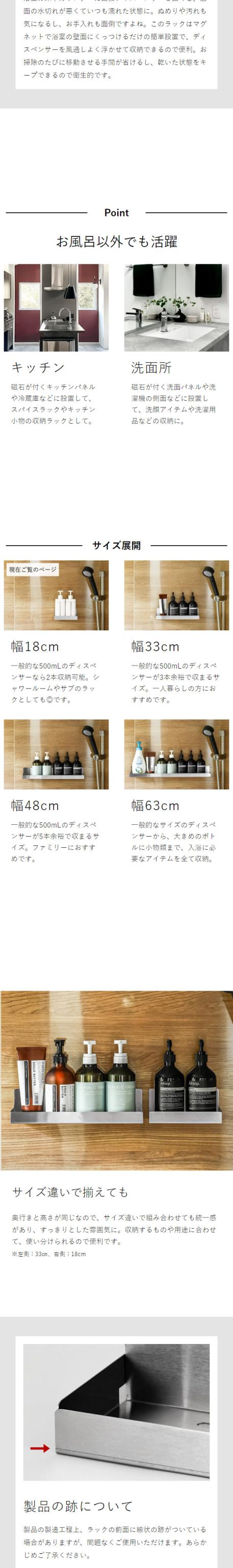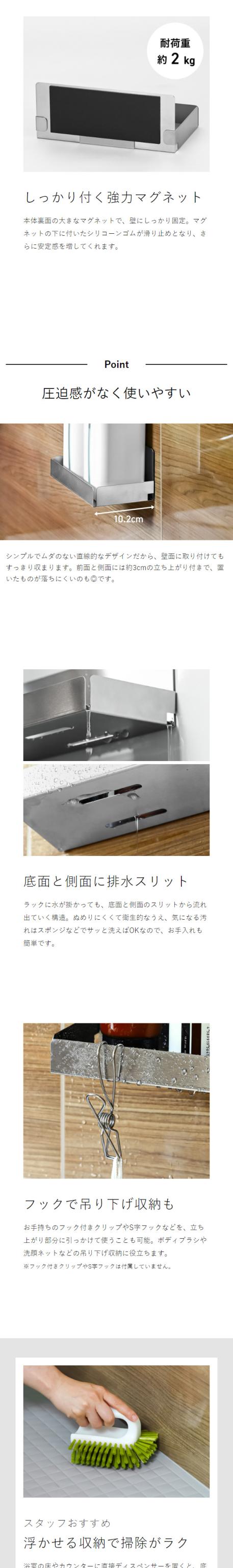 マグネットで浴室壁面に設置できる幅18cmのステンレス製バスラック。一般的な500mLボトルを2本収納可能、シャワールームやサブのラックとして◎。浮かせる収納で乾きやすくて衛生的です。
