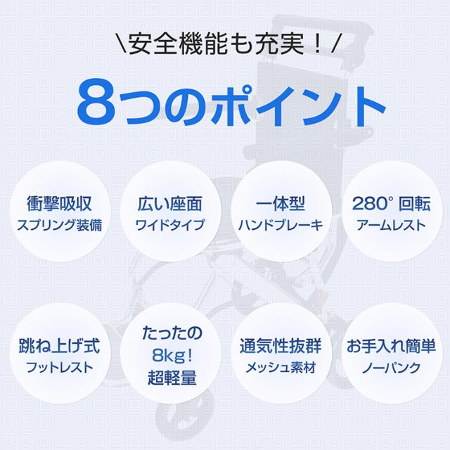 - 発注から5日で早く着きました!歩くのに歩行器だったのにコンパクトで軽く軽自動車にも場所取らない小ささで、使用の母も安定安心で乗れ、診察も他の患者さんに避けてもらわなくてもスムーズに通行できます。ありがとうございました?