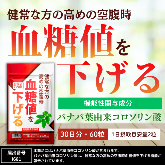 【届出表示】本品にはバナバ葉由来コロソリン酸が含まれます。バナバ葉由来コロソリン酸は、健常な方の高めの空腹時血糖値を下げる機能が報告されています。