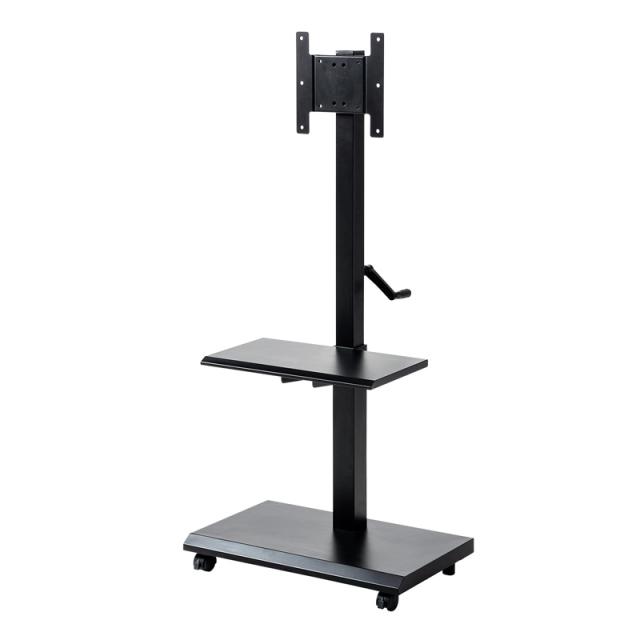小・中型ディスプレイの設置に最適。壁面へ寄せた設置でスペース確保できる手動上下昇降ディスプレイスタンド。20〜43型対応。ブラック。