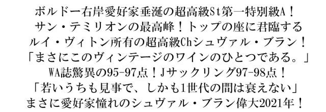 ボルドー右岸愛好家垂涎の超高級St第一特別級A! サン・テミリオンの最高峰!トップの座に君臨する ルイ・ヴィトン所有の超高級Chシュヴァル・ブラン! 「まさにこのヴィンテージのワインのひとつである。」 WA誌驚異の95-97点!Jサックリング97-98点! 「若いうちも見事で、しかも1世代の間は衰えない」 まさに愛好家憧れのシュヴァル・ブラン偉大2021年!
