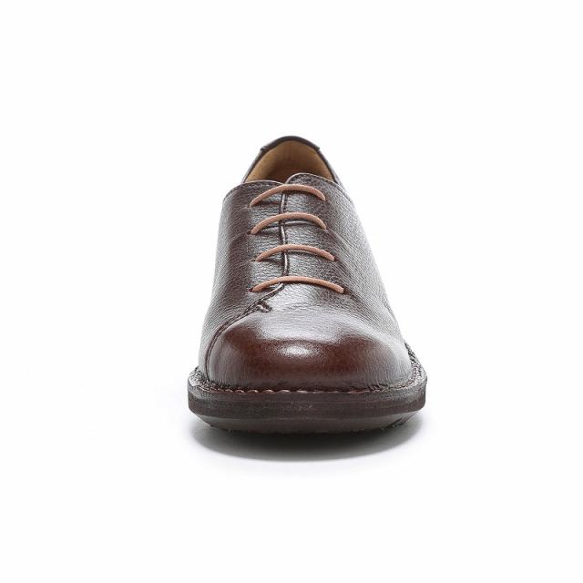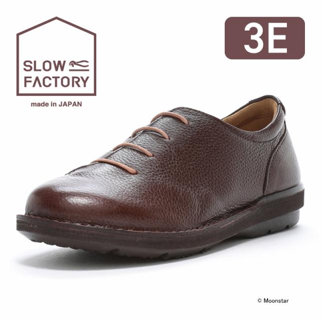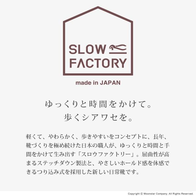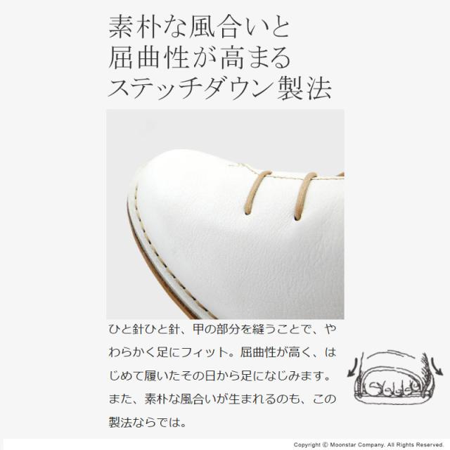 ムーンスター「Slow Factory」は1956年から革靴生産を担ってきた佐賀の工場でゆっくり時間をかけ丁寧に作った靴です。甲の部分はやわらかくフィットし屈曲性が良いステッチダウン製法、かかと周りはしっかりホールドするために革を内側に包み込むつり込み式になっています。ソールは足なりの形に立体的にフィットするPUダイレクト製法です。ソールそのものがフットベッドの役割をはたすので足にやさしくここち良いつくりです。左右のパターンを着物の様にあわせたひとひねりあるデザインの紐靴です。ヒールの高さは3cmで、重量は23.0cmで片足約240gです。【ベステック(R)ソール】ウレタンの劣化しやすい弱点を大きく改善した素材で、軽量性、弾力性、防滑性に富んだソールです。【足なり設計】足の特性に合わせて足裏にフィットするため、負担がかかりにくい設計です。