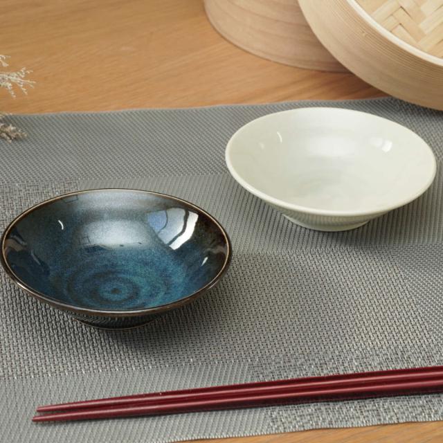 色や匂いがしみこまない磁器製なので、扱いやすく日常使いがしやすいです。光沢のあるつるりとなめらかな表面で窯変する釉薬を使用しています。釉薬のムラ、濃淡、形のゆがみが個々にいい味わいになっています。