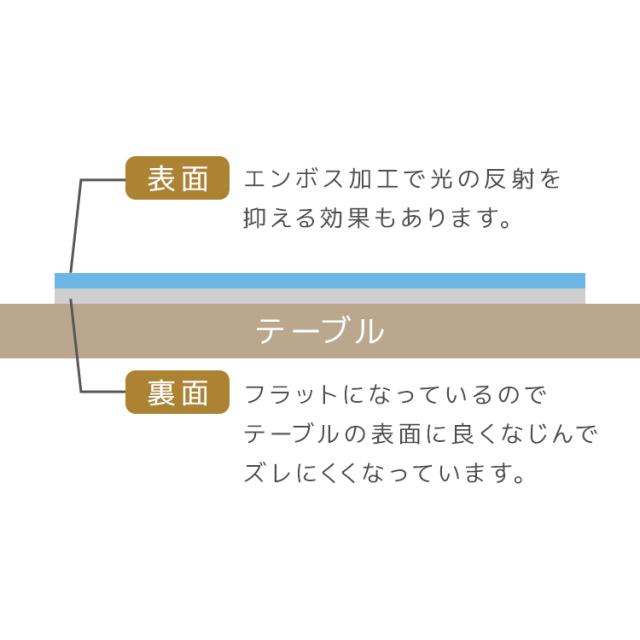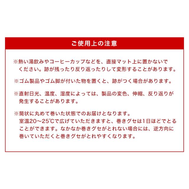 ・施工前に必ずテーブルの上を綺麗に掃除してください。 ・開封時は、新品特有の臭いがすることがあります。使用していくうちに徐々に緩和されていきますが改善されない場合は、風通しの良い場所で陰干しを行うと緩和されます。 ・お手入れは薄めた中性洗剤を湿らした布につけ、固く絞って拭いた後、水分が残らないように乾いた布で乾拭きしてください。 ・日の当たる所で使用しないでください。日焼けで硬化する場合があります。 ・商品は、モニターによって色合いが異なって見える場合があります。 ・仕様・デザインは改良のため予告なく変更することがあります。 |