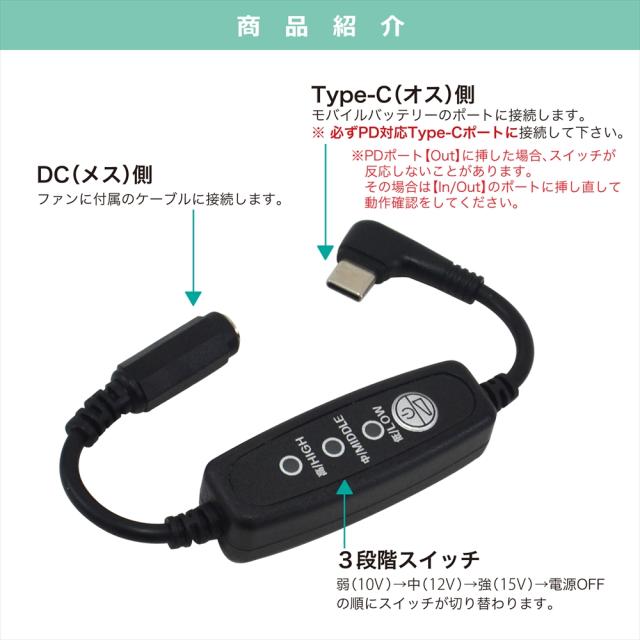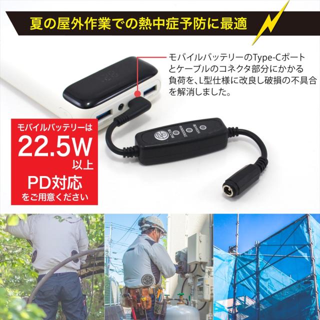 ・このアダプタにより、モバイルバッテリーをファン付き作業服のバッテリーとして使用できるようになります。