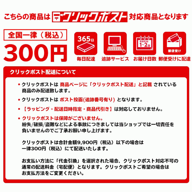 本商品5本までのご注文でクリックポスト配送(全国送料一律300円)を選択いただけます。代引きは対応不可となりますので予めご了承ください。