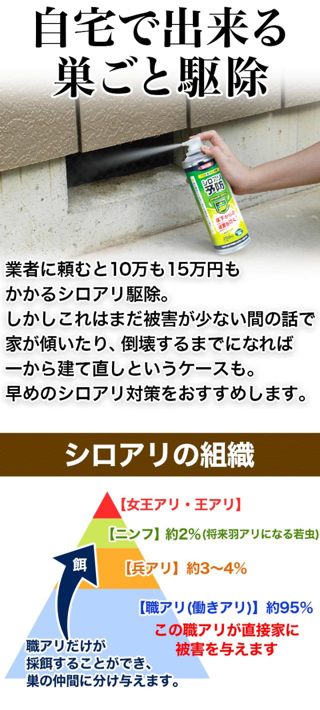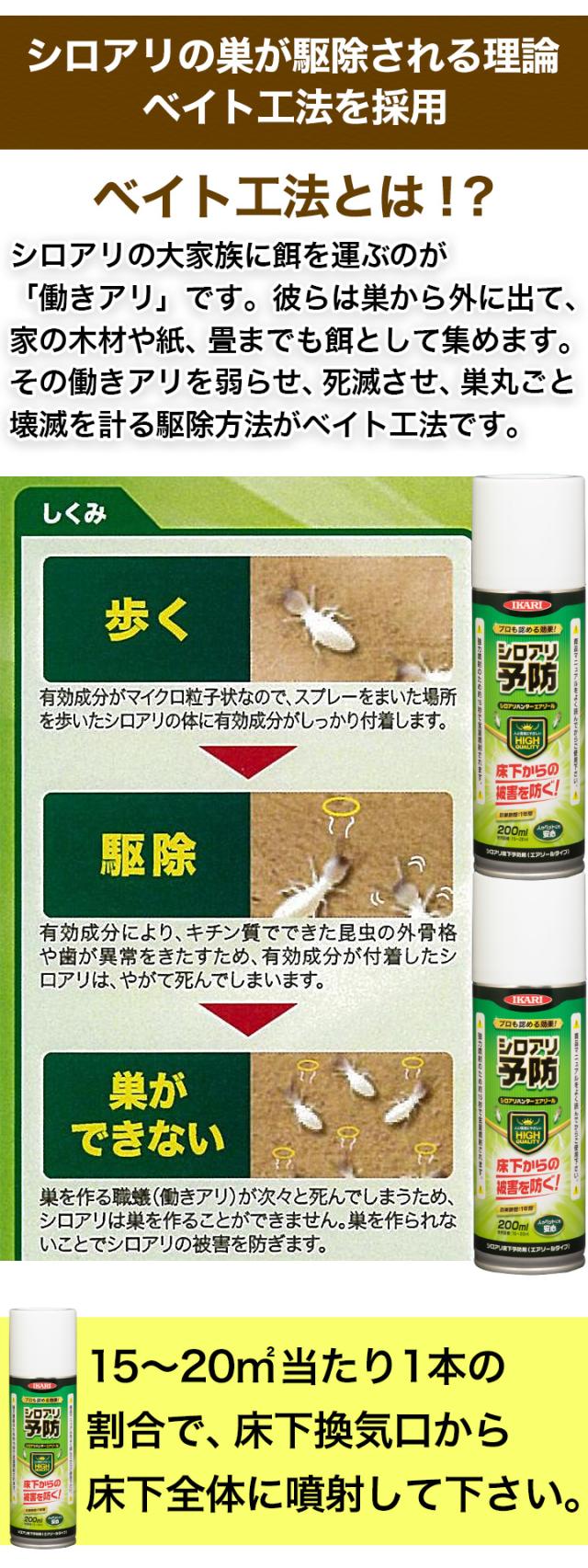 〇シロアリの巣ごと駆除するシステム「ベイトシステム」を利用した方法で方法でシロアリを駆除します。シロアリの大家族に餌を運ぶのが「働きアリ」です。彼らは巣から外に出て、家の木材や紙、畳までも餌として運んでいきますが、働きアリがいなければ、巣が作れない、巣が壊滅する。 →働きアリを弱らせ、死滅させ、巣丸ごと壊滅を計るシロアリ駆除方法がベイトシステムです。〇使用方法床下換気口からスプレーするだけ!僅か15秒(1本あたり)でシロアリ駆除が完了!細かな微粒子が床下空間に広く広がり付着 地面や基礎、そして床下の裏にもしっかり付着。1回噴射で約1年間、効果長持ち!オススメとしては、ワンシーズン(約半年)に1回使用されると更に安心です。家族にも!ワンちゃん猫ちゃんにも安全!本品の主成分「ビストリフルロン」は、昆虫だけに作用する成分です。狭い所を狙える長ノズル付!