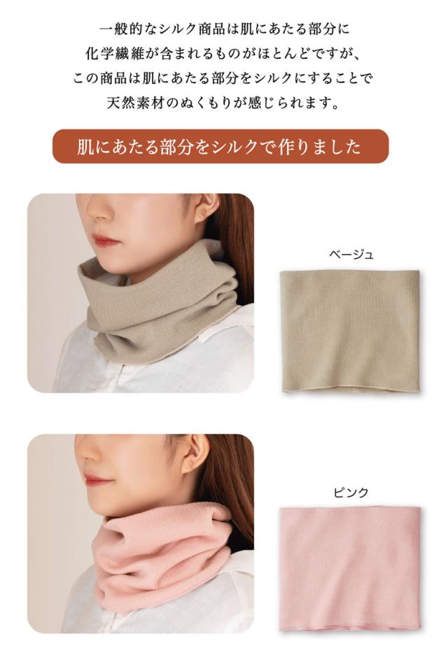 肌側がシルクで保温性と保湿性を高めた二重編み構造が特徴です。ゆったりとした付け心地で、首回りの防寒に様々なシーンでお使いいただけます。