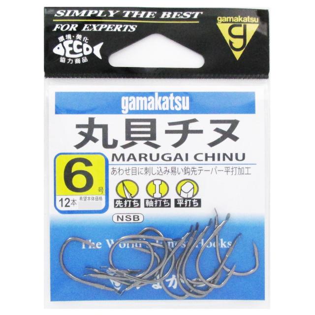 【がまかつ/Gamakatsu】イカダのチヌ釣りの丸貝専用鈎です。鈎先のテーパー平打ち加工により貝の合わせ目に刺し込みやすく、またチモトのすぐ下にもタタキを入れ、貝の合わせ目がピッタリ合うようにしました。鈎の特性を生かすため、チモトが短か目の設計になっております。このためハリスの巻きは5、6回程度までとなりますが、強度は充分に得られます。