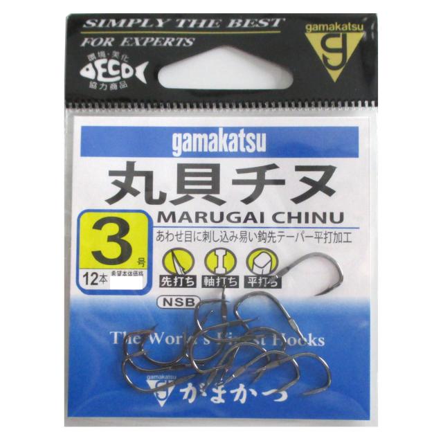 【がまかつ/Gamakatsu】イカダのチヌ釣りの丸貝専用鈎です。鈎先のテーパー平打ち加工により貝の合わせ目に刺し込みやすく、またチモトのすぐ下にもタタキを入れ、貝の合わせ目がピッタリ合うようにしました。鈎の特性を生かすため、チモトが短か目の設計になっております。このためハリスの巻きは5、6回程度までとなりますが、強度は充分に得られます。