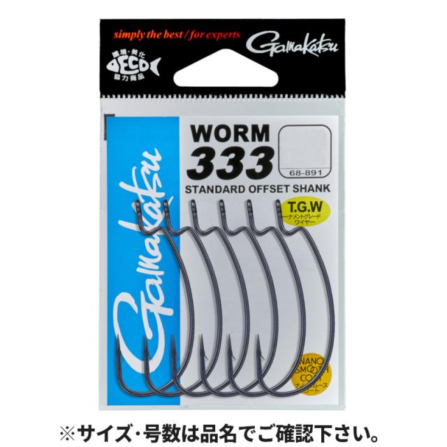 【がまかつ/Gamakatsu】ワーム333は、バスフィッシングの本場・アメリカのトーナメントサーキットを主戦場とするツアープロと開発されました。この極めて均整の取れたオフセットシャンクのワームフックは、数多あるワームの形状やサイズにも幅広いラインナップで、抜群のフィット感を示します。あらゆるカバーに対するスナッグレス性能の高さはもとより、即アワセから巻きアワセまでどんなフッキングスタイルにもアングラーのパフォーマンスに機敏に呼応します。T.G.W.を採用し、ナノスムースコートを施した333は、あらゆるフィールド、アプローチにトータルバランスの高さで応える近代ワームフィッシングにおけるハイスタンダードオフセットフックです。[T.G.W(トーナメントグレードワイヤー)/平打/管付/ナノ・スムース・コート(NANO SMOOTH COAT)]