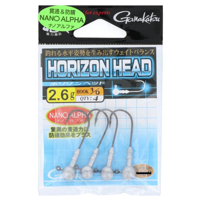 【がまかつ/Gamakatsu】捕食本能を刺激する『水平姿勢』を徹底追求!キーパー部分へウエイトを分散させることにより、スイミング時・フォーリング時にフィッシュイーターの捕食本能を刺激する「水平姿勢」を実現。あらゆる操作に対して素直なアクションを生み出す「パーフェクトラウンドヘッド」。ウエイト分散機能と、ワームのホールド性を向上させた「ダブルコーンキーパー」。様々なワーム・パターンに対応する、幅広いウエイトとフックサイズ。表面処理には、刺さりの良さに防錆効果をプラスした「ナノアルファ」を搭載。[HORIZON HEAD]