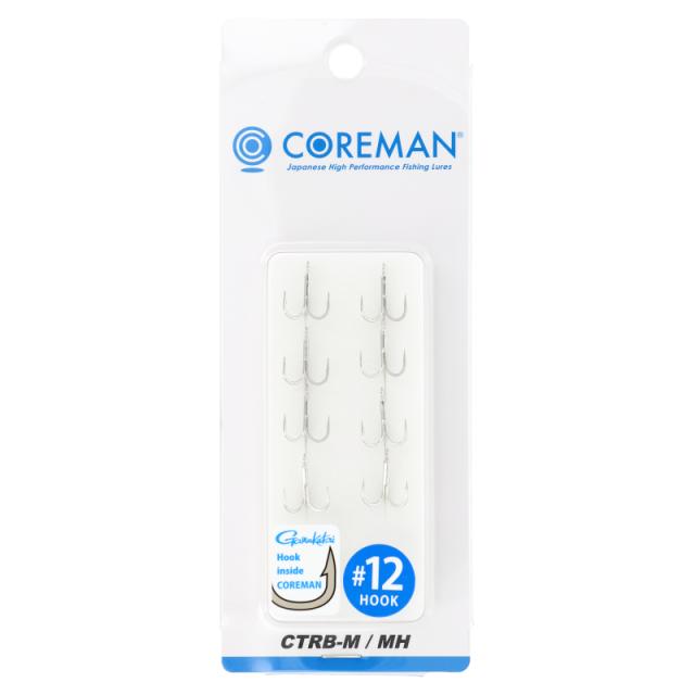 【コアマン/COREMAN】アイアンプレートシリーズの純正トレブルフックが、このたびパッケージが新しくなりリニューアルリリースになりました。刺さり抜群のトーナメントグレードワイヤー!アイアンプレート純正トレブルフック!信頼のがまかつ製フック「トレブルラウンドベンドミディアム」に特別表面メッキ処理(金属及び鉛製ルアーに装着の際、電蝕による変色がない錫メッキ)を施して、刺さりの良さと輝きの持続を実感できる、コアマンスペシャルフック。高強度、高靭性素材「トーナメントグレードワイヤー」の採用により、フックポイントの耐久性と全体強度が大幅に向上。スプリットリングへの装着が容易で、無用な変形を防ぐ、マジックアイ。自然にフッキングベストポジションを常に維持する、センターバランスアイ設計。ラウンドベンドフォルムが、高次元でのフッキング性能と高いホールディング性能を約束。ロングテーパードポイントが、優れた貫通性能を発揮。マイクロバーブ採用によりスムーズに貫通し、身切れを最小限に抑える事でバレを軽減。※CTRBは、コアマンのアイアンプレートシリーズの純正フックです。(がまかつ製)[COREMAN TREBLE ROUND BEND][CTRB-MH]