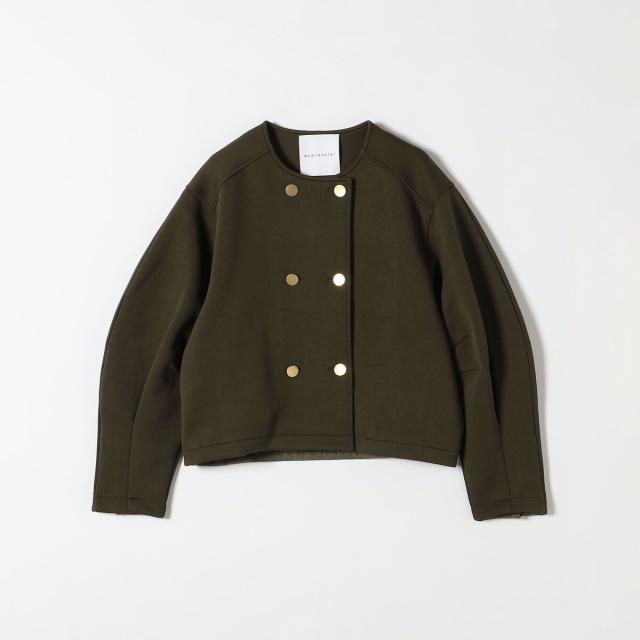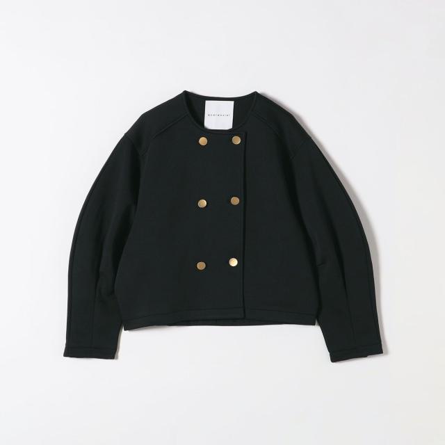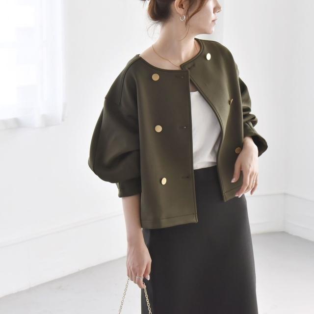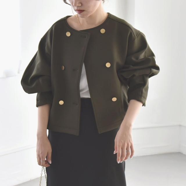 フロントボタンがクラシカルな印象の、カーディガン感覚で使えるダブルジャケット。